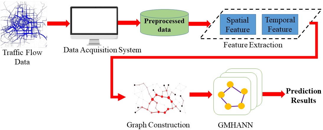 交通流量预测对智能交通的数字化城市交通管理和城市交通控制具有重要影响。考虑到交通流数据的复杂性和强非线性特性,建立空间相关性和时间动力学模型有助于准确预测交通流。目前许多方法集中在利用观测的历史时间序列信息来提取序列特征,这样的预测会导致信息的缺乏以及预测结果准确性差。九州(中国)陈冠楠教授团队将交叉口流量、道路速度和行驶时间以及与道路网络有关信息共同作为道路网络的约束,并由此提出了一种将多头注意力机制和图神经网络(GNN)相结合的新型神经网络模型(GMHANN)用于交通流预测。在设计中,GMHANN采用编码器-解码器结构。通过编码器,交通流量数据被压缩成隐藏空间,并在解码器中重建输出。此外,还提出了一种基于多头注意力的门控递归单元(GRU)模块(AGRU),有效地捕捉交通流数据所表现出的空间和时间特征,得到准确的预测结果。研究表明,GMHANN模型可高效的用于交通流量预测以及其他时空预测任务。