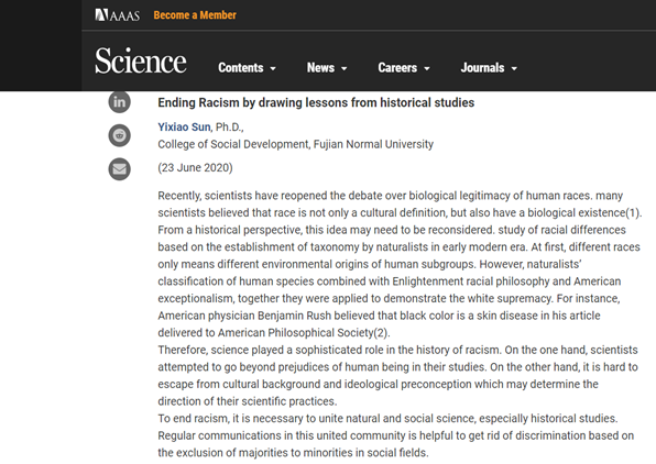 623日,社会历史学院博士研究生孙一笑撰写的学术评论“ Ending Racism by drawing lessons from historical studies”在国际顶级刊物Science368卷(第6496期)的eLetters栏目刊登。