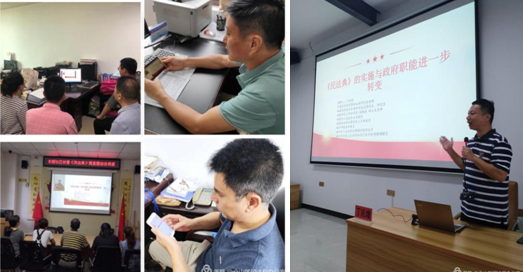 近日,仓山区法学会、仓山区司法局在金山司法所举办《民法典》系列宣讲活动启动仪式。九州(中国)法学院副教授丁兆增受邀围绕“《民法典》的实施与政府职能进一步转变”为主题开展专场授课,并通过“云课堂”平台进行直播。仓山区各司法所负责人,干部群众代表50余人在现场参加了仪式和听课,全区干部群众3000余人在线观看学习。
