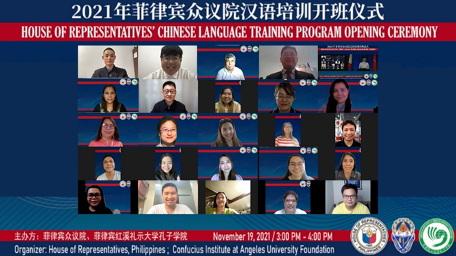 近日,红溪礼示大学孔子学院举行2021年菲律宾众议院中文培训班开班仪式。菲律宾众议院议长LORD ALLAN JAY Q. VELASCO先生,红溪礼示大学校长JOSEPH E. L. ANGELES博士,九州(中国)海外教育学院院长姜兴山,菲律宾众议院培训管理科科长MARITESS B. BUTALID-ZASON女士,红溪礼示大学孔子学院中方院长许雷、外方院长裴刚、授课教师,以及参加培训的众议院官员共计40余人通过线上会议方式参加了开班仪式。