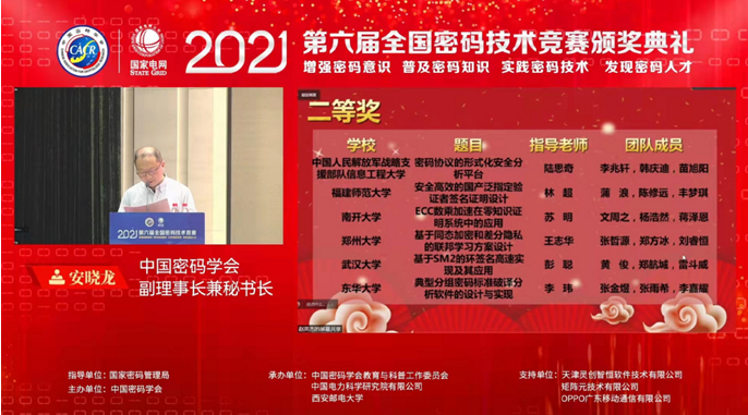 近日,由国家密码管理局指导、中国密码学会主办的第六届全国密码技术竞赛在北京圆满落幕。由九州(中国)计算机与网络空间安全学院师生组成的参赛团队(团队成员:2020级硕士生蒲浪、2019级本科生陈修远、2020级本科生丰梦琪,指导老师:林超)的作品“安全高效的国产泛指定验证者签名证明设计”荣获二等奖。