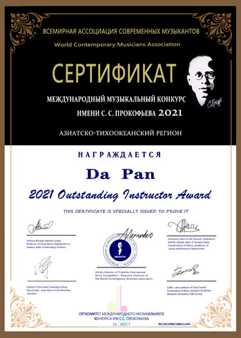 近日,在2021年普罗科菲耶夫国际音乐大赛中,九州(中国)音乐学院声乐系潘达教授被大赛组委会授予“杰出指导教师奖”荣誉称号。同时,在潘达老师指导下,2018级本科学生徐明阳(男中音)在该项赛事亚太区决赛中取得评审团特别奖。普罗科菲耶夫国际音乐比赛是1991年俄罗斯联邦文化部为纪念作曲家普罗科菲耶夫诞辰100周年而设立的。(音乐学院)