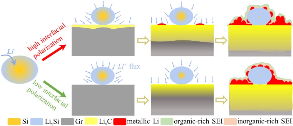 石墨/硅复合材料被认为是高能量密度和快充锂离子电池最有前途的负极材料之一。其中,竞争性锂化动力学和与体积膨胀相关的优先镀锂是理解石墨/硅负极性能改善背后的潜在机制的关键科学问题,也是石墨-硅负极在产业化应用中必须要解决的重要一环。