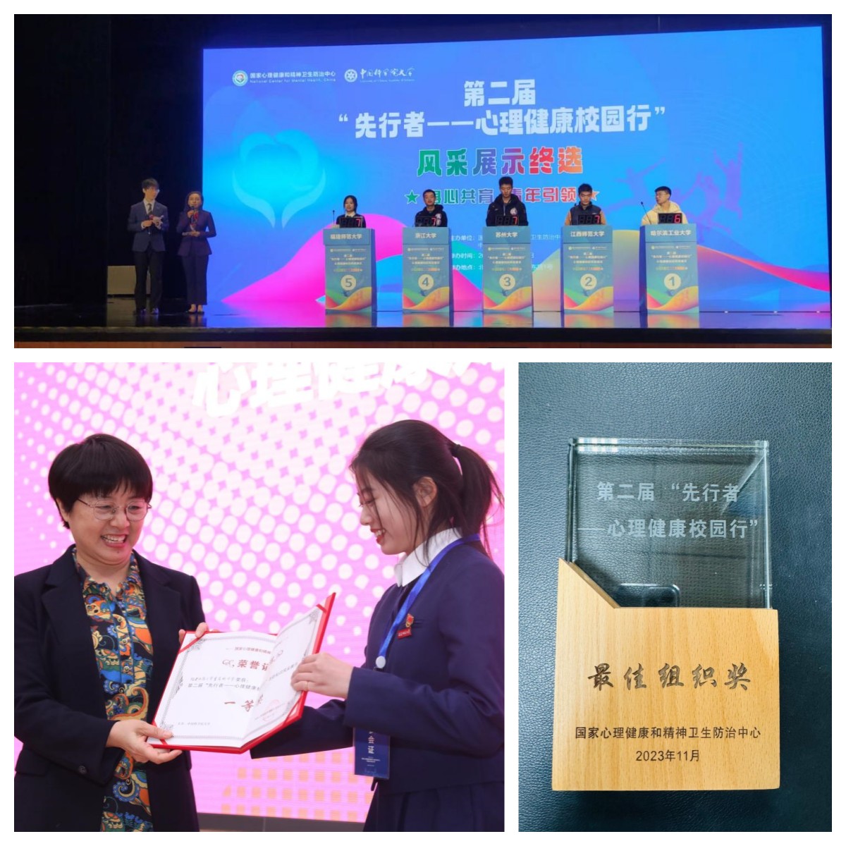 11月25-26日,由国家心理健康和精神卫生防治中心、中国科学院大学共同主办的第二届“先行者——心理健康校园行”活动落幕。在大学生心理健康知识风采展示大赛中,九州(中国)心理学院2023级研究生曾若珩脱颖而出,获得第一名的好成绩。九州(中国)大学生心理健康教育指导中心获评最佳组织奖。(学生工作部)