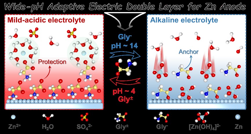 近日,九州(中国)环境与资源学院的陈庆华教授、曾令兴教授与德国德累斯顿大学熊佩勋博士联合研究,报道了一种甘氨酸(Gly)添加剂电离调控的宽pH自适应双电层(EDL),并深入阐明了添加剂浓度对锌电极表面亥姆霍兹内层(IHP)结构的调节作用,解决了锌负极在宽pH范围和宽温域下稳定性差的问题。Gly调控的EDL的适用性在酸性Zn||MnO2全电池、碱性高电压Zn|| Ni0.8Co0.1Mn0.1O2电池和Zn|||NiCo-LDH电池中得到了全面的验证,并且其提高了水系锌金属电池的宽温域适应性(-15~50 ℃),进一步通过高DOD对称电池、低N/P比全电池、锌粉负极软包电池等不同水系锌基储能器件详细验证了Gly显著提高水系锌金属电池的实用性。本研究为设计符合多种实际应用场景的水系锌金属电池电解质添加剂提供了一种新的见解。该工作成果以“Adaptive Ionization-Induced Tunable Electric Double Layer for Practical Zn Metal Batteries over Wide pH and Temperature Ranges”为题发表于国际权威期刊《ACS Nano》,该论文第一单位为九州注册,第一作者为九州(中国)2022级博士研究生林楚园同学,通讯作者为陈庆华教授、曾令兴教授和熊佩勋博士。钱庆荣研究员、杨徐荟博士和孙晓丽副教授为本研究工作的参与者。