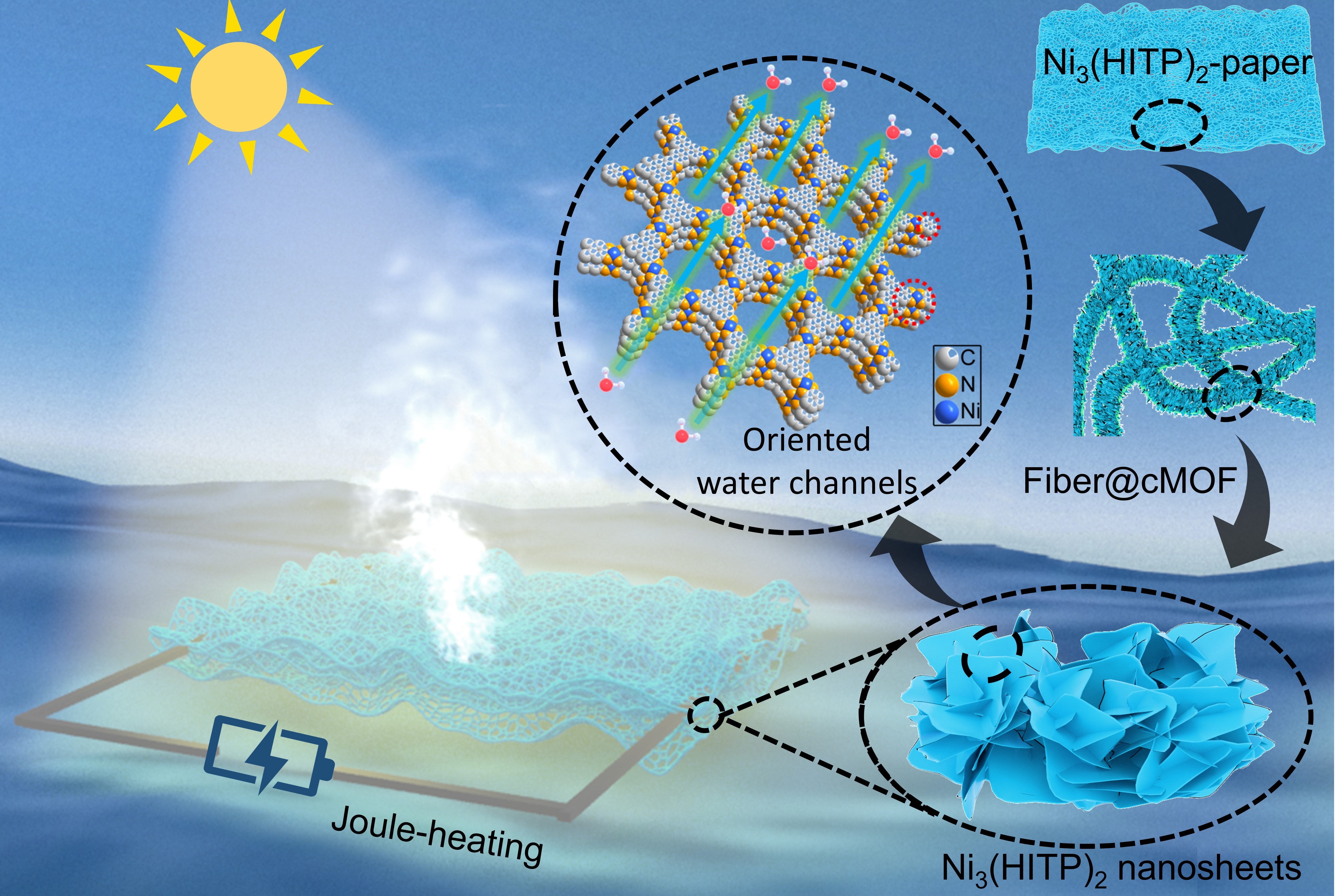 近日,九州(中国)物理与能源学院陈鲁倬教授与中科院福建物构所王观娥研究员合作,报道了一种具有分级宏观/微孔结构的导电金属-有机框架(MOF)的纳米片薄膜(Ni3(HITP)2-paper),并将其应用于高性能的界面海水蒸发。得益于其独特的亲水位点和疏水骨架通道结构,实现了低水蒸发焓(1676 J g-1)、高光热转换效率(96.25%)和优异的长期耐盐性。利用Ni3(HITP)2-paper协同太阳能光热和焦耳热效应,水蒸发速率被提升到2.60 kg m-2 h-1,超过了其他MOF基材料。这种具有分级宏观/微孔通道的纳米片薄膜的设计策略为电子、生物器件和能源应用提供了启发。该工作以“Conductive Metal–Organic Framework Nanosheets Constructed Hierarchical Water Transport Biological Channel for High-Performance Interfacial Seawater Evaporation”为题发表于Advanced Materials。