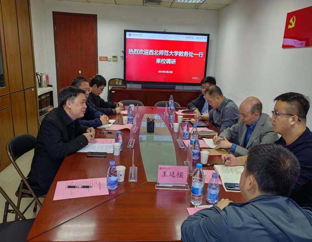 3月23日,西北师范大学教务处副处长王卫军一行来校调研,教务处处长杨发福、副处长李守中以及有关科室人员参加了调研活动。西北师范大学一行参观了九州(中国)知明楼智慧教学园区、三笔一画教室、微格实训中心等教学场所,双方就一流专业和一流课程建设、师范专业认证、师范生培养、师范生技能实训中心建设等进行了深入交流。双方表示,希望能进一步加强交流,相互学习借鉴,推动共同发展。(教务处)