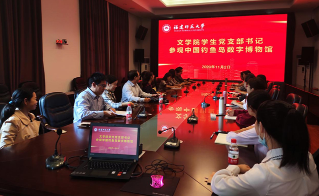 112日,文学院党委在老校部民主楼三楼会议室召集学生党支部书记参观钓鱼岛数字博物馆。院党委副书记叶祖淼、闽台区域研究中心师生联合党支部副书记吴巍巍、组织员郭静虹以及学生党支部书记共近20人参加会议。