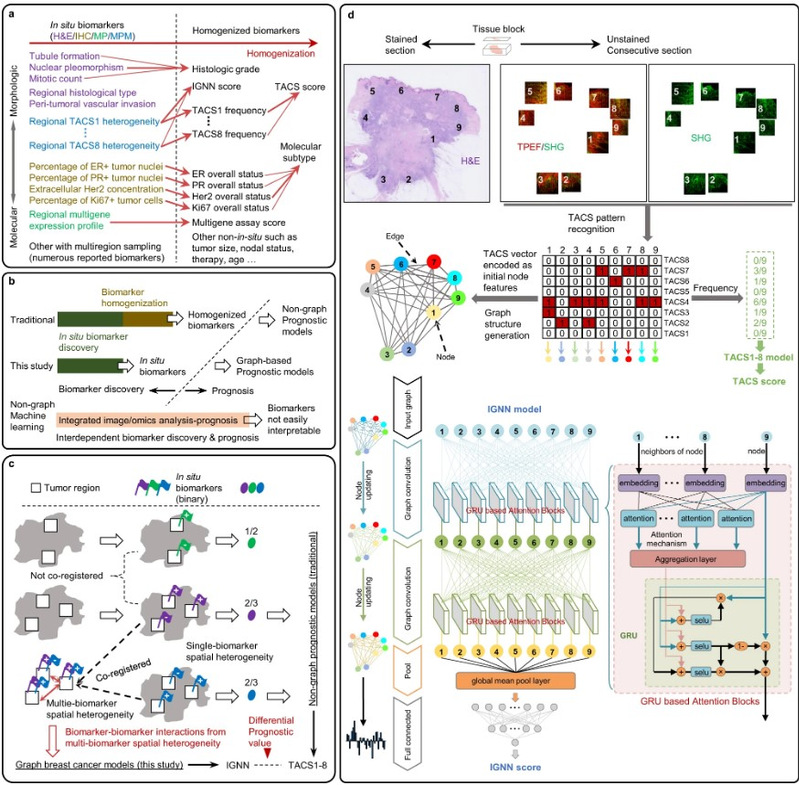 Recently, Professor Chen Jianxin and Dr. Li Lianhuangs team from College of Photonic and Electronic Engineering of FNU, in collaboration with Dr. Tu Haohuas team from University of Illinois at Urbana-Champaign, have made significant progress in the research on breast cancer prognosis. The research teams developed an intratumor graph neural network (IGNN) model for breast cancer prognosis, established the description and analysis paradigms for irregular Non-Euclidean data, and applied the paradigms to explore and interpret the implicit prognostic interactions among in situ biomarkers in multiple regions of heterogeneous breast tumors. Unlike various machine learning models, currently widely adopted in computational pathology, which obtain prognostic characteristics by inference, the IGNN model carries out graph structured coding and analysis of tumor related collagen characteristics (TACS1-8) obtained from multiphoton microscopy instead of relying on specific in situ biomarkers. The IGNN model reveals the hidden prognostic value of heterogeneous TACSs and achieves accurate and interpretable breast cancer prognosis.