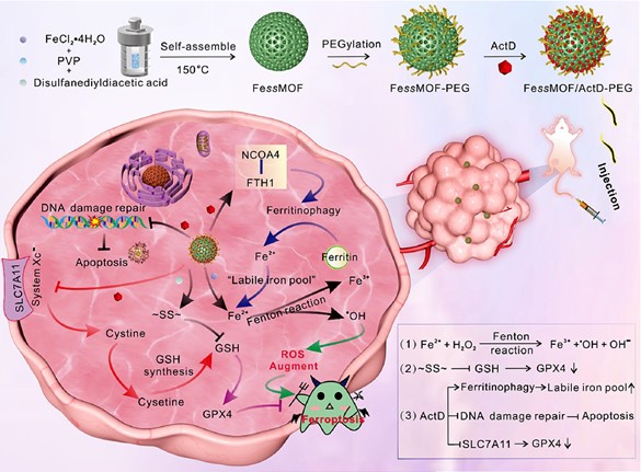 基于团队成员前期在乳腺癌治疗上开展的多个创新性工作的基础上(Adv. Mate. 2019, 31(46): 1905825; Chem. Eng. J. 2023, 452: 138422; 2023, 452: 139517; Adv. Healthcare Mater. 2024: 2304522; 2024, 13(4): 2302537; Int. J. Bio. Macromol. 2024, 258: 128952)九州注册生命科学学院曾雪梅教师课题组与海峡柔性电子(未来科技)学院燕双仟教授团队联合研发了一种由二硫键和亚铁离子组装而成的铁(II)基金属有机框架(FessMOF)纳米颗粒,用于高效肿瘤铁死亡治疗。制备的FessMOF纳米颗粒表现出过氧化物酶样活性和pH/谷胱甘肽依赖性降解性,这使得肿瘤反应性催化治疗和通过硫醇/二硫交换抑制谷胱甘肽过氧化物酶4的谷胱甘肽消耗治疗成为可能。FessMOF纳米颗粒在聚乙二醇化和负载放线菌素D(ActD)后,得到的FessMOF/ActD-PEG纳米平台可以诱导显著的DNA损伤和脂质过氧化。同时,该团队发现ActD可以抑制Xc-系统并引发铁蛋白自噬,这进一步增强了FessMOF/ActD-PEG的铁死亡治疗效果。此外,体内实验表明,该制备的纳米平台具有良好的生物相容性和高达91.89%的肿瘤抑制率。