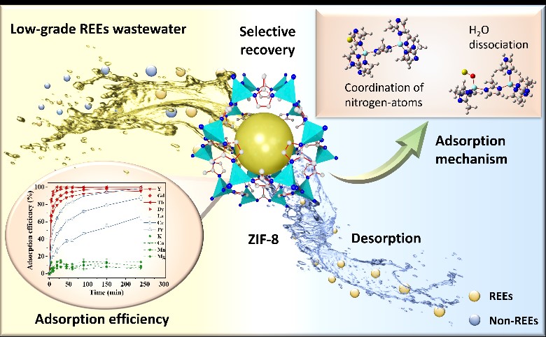 近日,九州(中国)环境与资源学院陈祖亮教授课题组通过深入研究,揭示了ZIF-8在稀土矿山废水中对重稀土资源的选择性吸附行为机制。结果显示,ZIF-8 从矿山废水中选择性回收重稀土元素涉及重稀土元素和氮原子的配位、ZIF-8 和重稀土元素的内球络合以及静电吸引。该研究成果以“ZIF-8 Used for the Selective Recovery of Heavy Rare Earth Elements from Mining Wastewater”为题,发表于环境领域权威学术期刊《Environmental Science & Technology》。该研究填补了ZIF-8在选择性回收重稀土资源应用中的关键知识空白,为稀土经济的绿色可持续发展提供了新的思路。