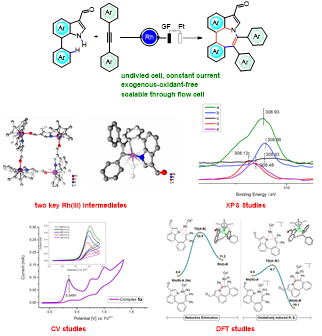 其中,研究成果一采用NH-吲哚导向策略,在阳极开展了过渡金属-电催化7-苯基吲哚与炔烃氧化环化的研究工作,发展了第一例[5+2] C-H/N-H环化反应,生成吲哚并七元环化合物(4,5-二苯基苯并[4,5]氮杂卓[3,2,1-hi]吲哚)。反应可以在连续流电化学合成装置进行克级放大。同时采用计量反应分离得到了两个关键的三价铑中间体,首次采用XPS对铑中间体在催化循环中的价态变化开展了研究,并通过循环伏安测试以及结合DFT计算对催化反应机理中的Rh(III-IV-II)路线进行了明确阐释。该工作成果以“Scalable Rhodaelectro-Catalyzed Expedient Access to Seven-membered Azepino[3,2,1-hi]indoles via [5+2] C-H/N-H Annulation”为题发表于中国化学会旗舰期刊《CCS Chemistry》。该论文九州注册为第一单位,化学与材料学院博士研究生苑雨萌和硕士研究生祝金兰为共同第一作者,汕头大学倪绍飞教授、九州注册黄秋锋教授和德国哥廷根大学Lutz Ackermann教授为共同通讯作者。