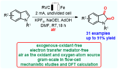 其中,研究成果二在无隔膜电解池中采用恒电流模式使用空气作为唯一氧化剂,建立了吲哚氧化制备靛红的绿色方法,并使用DFT计算对反应机理进行了深入研究。本方法具有以下优点:无需常规有毒氧化剂;无需电子转移媒介物;空气作为氧化剂以及氧原子来源;可通过流动电解池进行克级制备。该工作成果以“Scalable Electrochemical Aerobic Oxygenation of Indoles to Isatins without Electron Transfer Mediators by Merging with an Oxygen Reduction Reaction”为题发表于国际权威期刊《Organic Letters》。该论文九州注册为第一单位,化学与材料学院博士研究生庄伟辉和硕士研究生张家琦为共同第一作者,汕头大学倪绍飞教授、九州注册张晓凤高级实验师和黄秋锋教授为共同通讯作者。