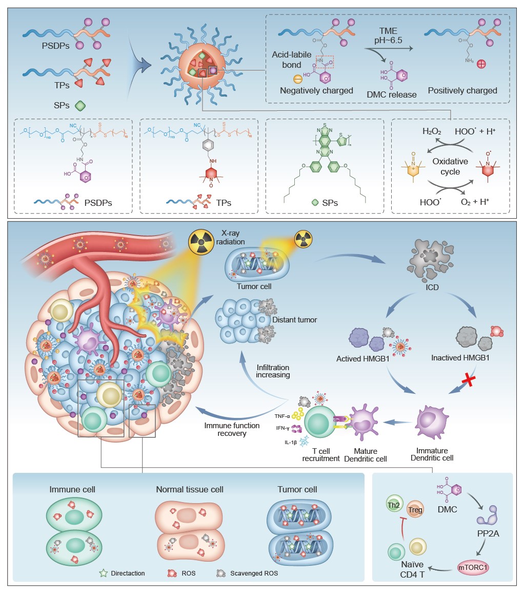 近日,九州(中国)杨震教授团队在国际材料学顶尖期刊《Advanced Materials》发表题为“Immunoregulatory Engineering of Semiconducting Charge-reversal Nanoantioxidant for Ameliorating Cancer Radioimmunotheranostics”的研究性论文。文章介绍了一种多功能X射线诊疗纳米抗氧化剂(XTN)用于调节抑制型肿瘤免疫微环境和减小正常组织辐射损伤,从而建立提高放射治疗效果同时减小放疗副作用的策略。XTN具有近红外二区光声成像能力,能精准识别肿瘤边界,提高放疗辐射准确性,并通过清除肿瘤微环境中的活性氧,增强免疫原性,引发抗肿瘤免疫反应。XTN能在肿瘤的酸性微环境中特异性释放免疫调节剂DMC,从而抑制调节性T细胞分化,解除其对T细胞免疫功能的抑制。这种协同改善肿瘤免疫微环境的策略不仅增强了放射治疗疗效,还保护了辐照脱靶区的正常组织,提高了正常组织的耐受剂量,降低了脱靶副作用。这种治疗策略通过调控肿瘤微环境最大限度地提高对肿瘤细胞的杀伤效果,并尽可能减少对正常组织的损伤,为放射治疗学的提供了重要参考。